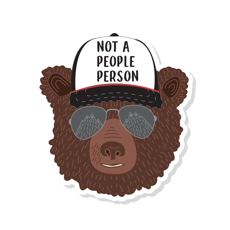 Add some cool vibes to your accessories with our bear sticker featuring a trucker hat and aviators! This awesome design showcases a bear who's definitely 'not a people person.' Get ready to make a statement with this unique and trendy sticker.