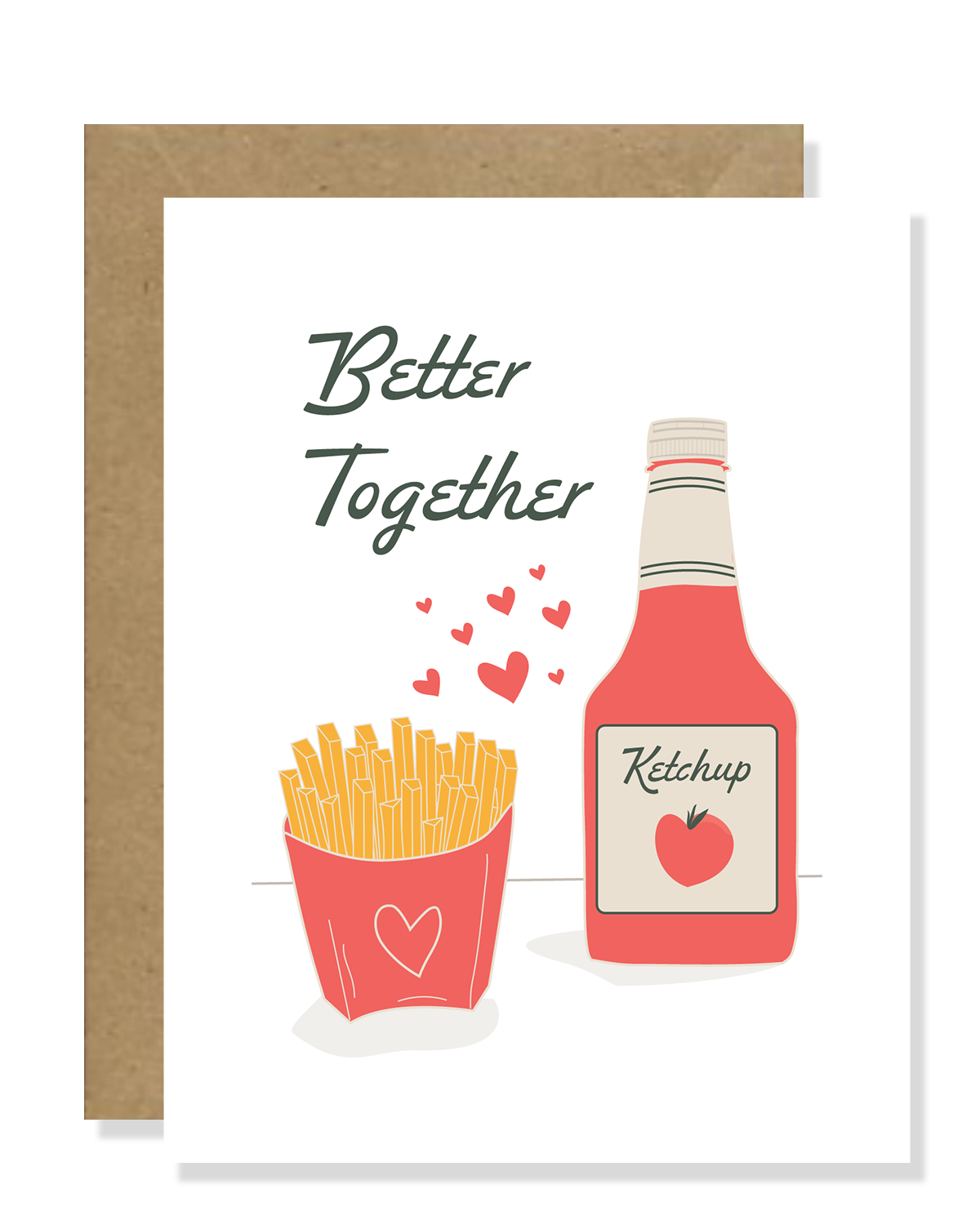 Discover the charm of our handcrafted minimalist greeting cards. Made with love, this card features a unique, design of two things that are just better together, French fries and ketchup Printed on high-quality 100lb linen paper, accompanied with a coordinating brown envelope, these cards are the perfect blend of simplicity and sophistication. Make your greetings stand out with our handmade card that say, 'better together!' Elevate your celebration with a touch of artistry from our collection.