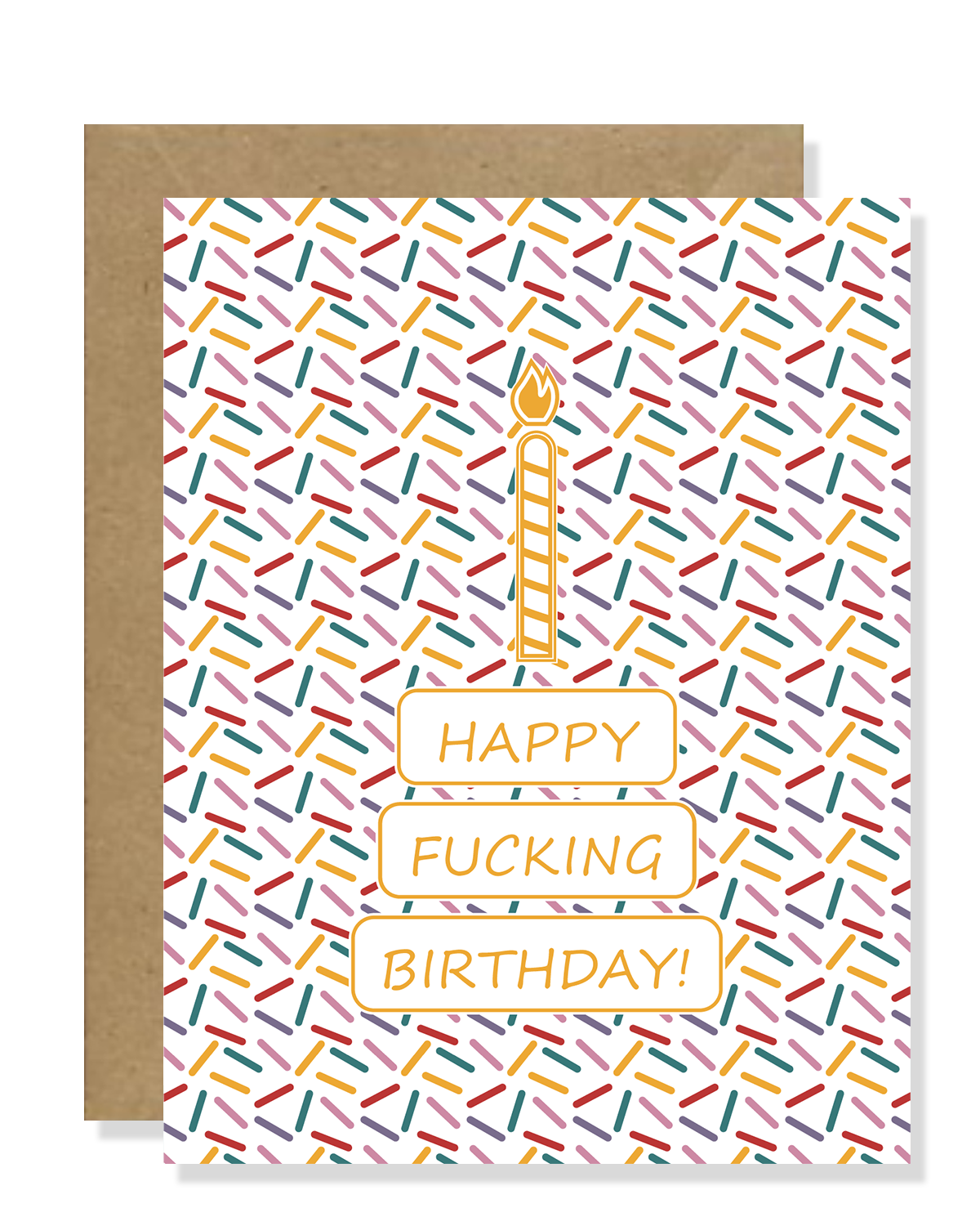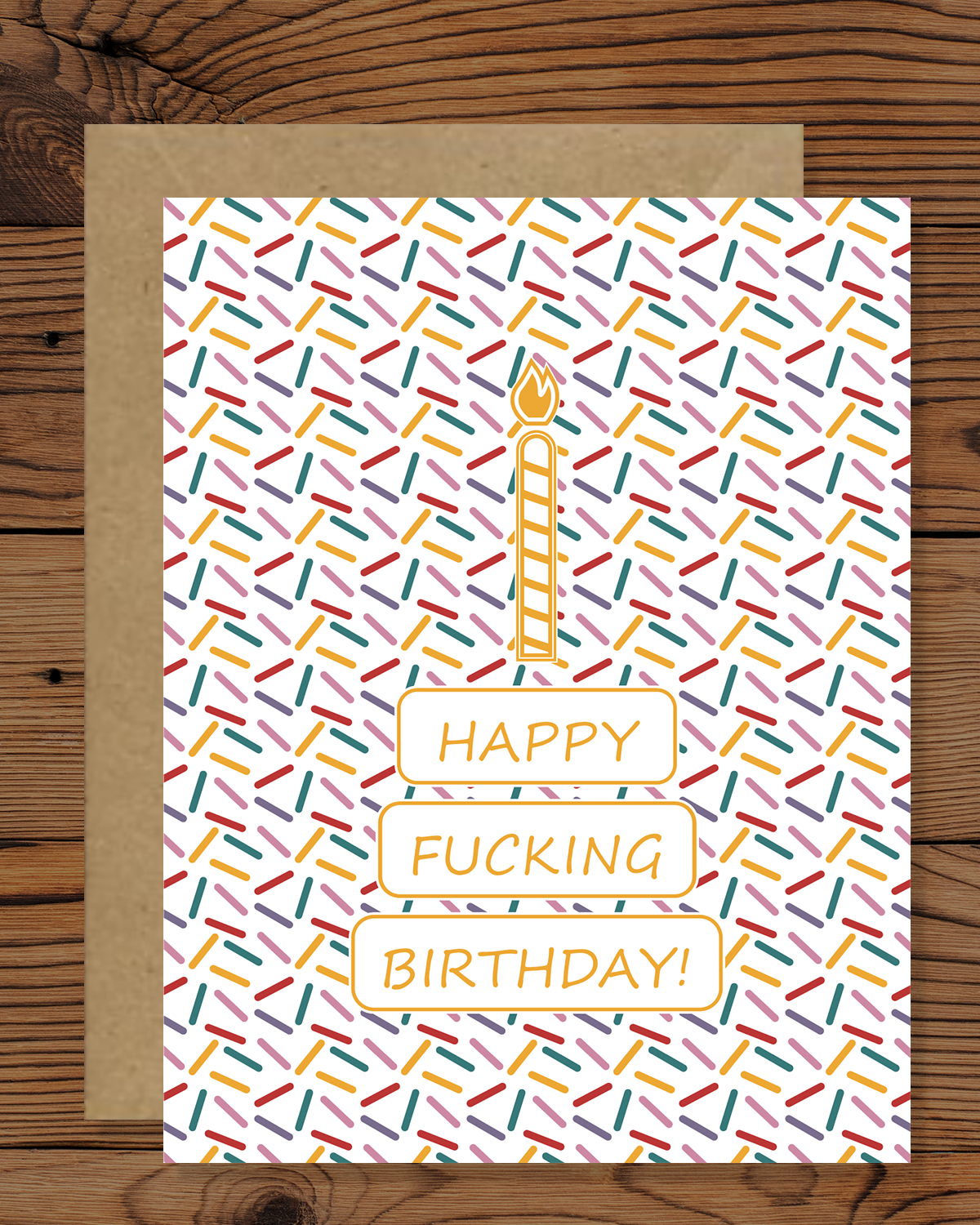 Celebrate their birthday with a burst of colorful, unapologetic joy with our "Happy Fucking Birthday" Sprinkle-Covered Card! This bold and cheeky card features a riot of vibrant sprinkles, echoing the excitement of the special day, and the exuberant message that leaves no room for subtlety. Perfect for those who appreciate a dose of humor and candor, it's a fantastic way to send warm wishes while adding a touch of irreverence to the celebration. When ordinary birthday greetings won't do, let this card make a bold statement that captures the essence of a truly unforgettable day. It's time to sprinkle some fun into their life and wish them the happiest, most memorable fucking birthday ever!