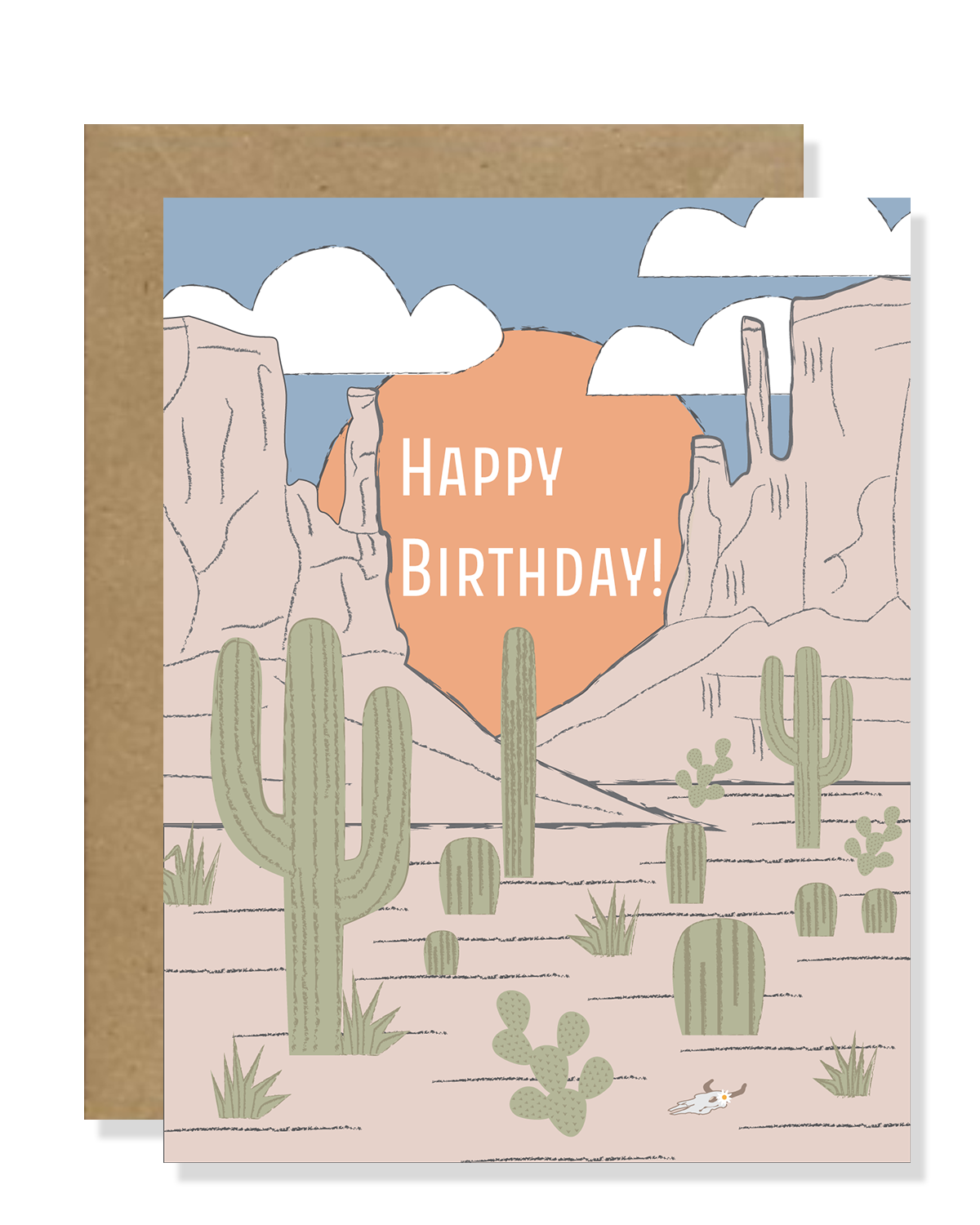 Discover the charm of our handcrafted minimalist greeting cards. Made with love, this card features a unique design of the Monument Valley, Arizona desert. Printed on high-quality 100lb linen paper, accompanied with a coordinating brown envelope, these cards are the perfect blend of simplicity and sophistication. Make your greetings stand out with our handmade card that say, 'Happy Birthday ' Elevate your celebration with a touch of artistry from our collection.